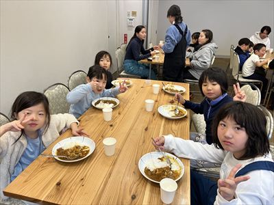 今日のメニューはカレーライス、いつものようにみんなたくさん食べてお代わりもたくさんしていました。