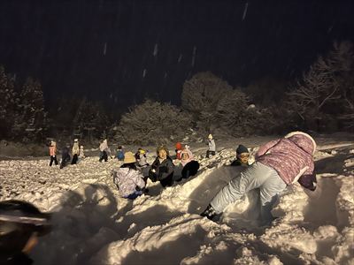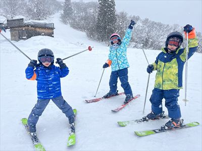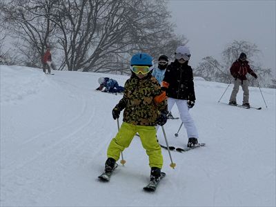 午後は雪がたくさん降る中、新しいコースにも挑戦し、板を揃えたターン練習や動画撮影を行い、集中しながら楽しく滑ることができました。