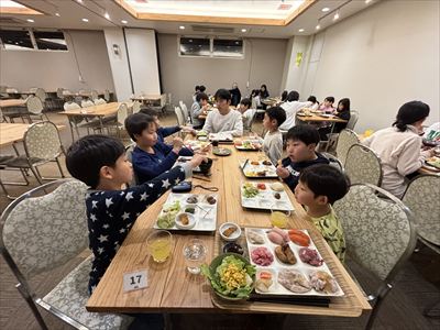 今朝も美味しそうな料理が並んでいて、子どもたちは好きなものを思う存分食べてスキーに備えました。