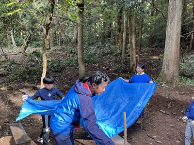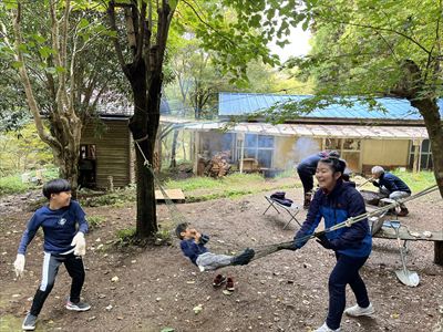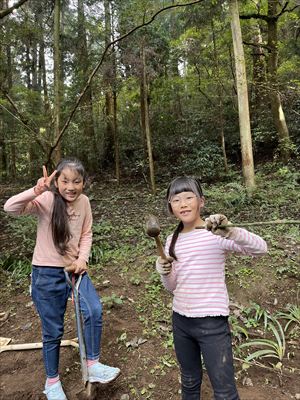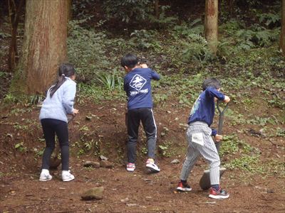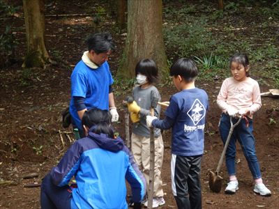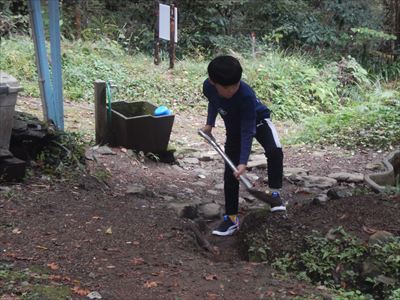 リピーターの子たちはやりたいことがあらから決まっているようで、スコップやのこぎりを手に穴を掘ったり木を切ったりと早速始めます。