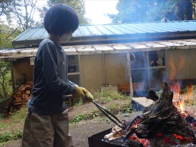 また焚き火に興味を持ったら木の枝や杉の葉を拾ってきて、焚き火にくべたり。